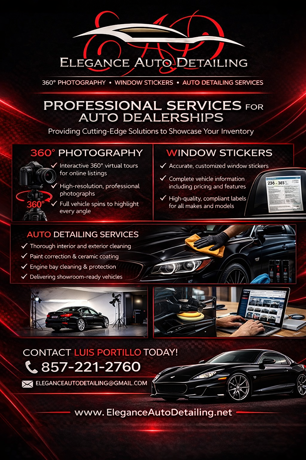 We are more than a detailing company- we are your dealership’s presentation partner. Elegance Auto Detailing delivers a complete, streamlined solution that combines detailing, photography, window stickers, and inventory management into one reliable service. We help dealerships eliminate delays, reduce vendor headaches, and maximize the value of every vehicle on the lot. With over 20 years of experience.